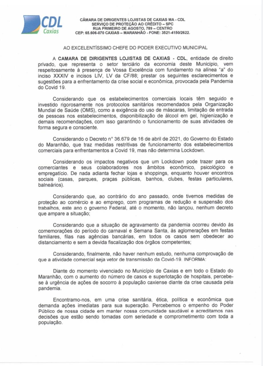 A entidade encerra a carta dizendo que estão cientes das suas responsabilidades, no sentido de que precisam redobrar os cuidados relacionados com a proteção da saúde dos seus colaboradores, mas também, de que precisam manter os postos de trabalho dessas mesmas pessoas. E, estão dispostos a trabalhar em conjunto para enfrentar a disseminação à covid-19 em Caxias (MA).